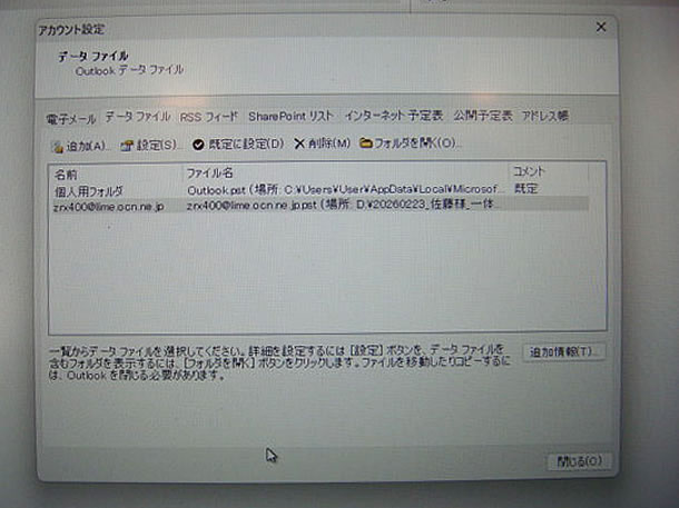 Outlookデータファイルはこのままですとメールの内容が見れない為、一旦別PCのOutlookで読み込みを行います。